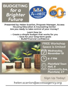 Budgeting for a Brighter Future - FREE Workshop NovemberNov 19 2025 06:00pm - 07:00pmPlainfield Town Hall - 8 Community Avenue, Plainfield, CT, United States